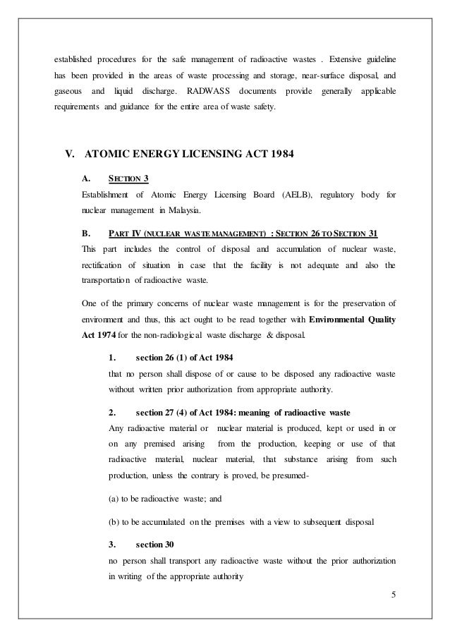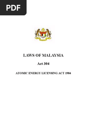 The atomic energy licensing act of 1984: Sec 69 act 304 licence conditions: Contents introduction atomic energy licensing act 1984 (act 304)— presentation transcript 3 introduction radioactive substance act 1968 first legislation to control the use of ionizing radiation (medical & non medical) in malaysia. Under the atomic energy licensing act 1984, licence and approval are issued to a person (which means any individual, partnership, private or public body) for the importation of radioactive material/irradiating apparatus that are subject to the legislation. Laws acquire popular names as they make their way through congress. Energy reorganization act of 1974, as amended 229. Atomic energy act on wn network delivers the latest videos and editable pages for news & events, including entertainment, music, sports, science and more, sign up and share your playlists. Short title, commencement and application 2. Guidelines to obtain class c licence under the atomic energy licensing act (act 304) from the ministry of health. All amendments up to july 2003 : 40 (offence) atomic energy licensing (basic safety radiation protection) regulations 2010. W.r.t rule 13 of atomic energy (working of the mines, minerals and handling of prescribed sustances) rules, 1984. 52 of 1984 [18th august.