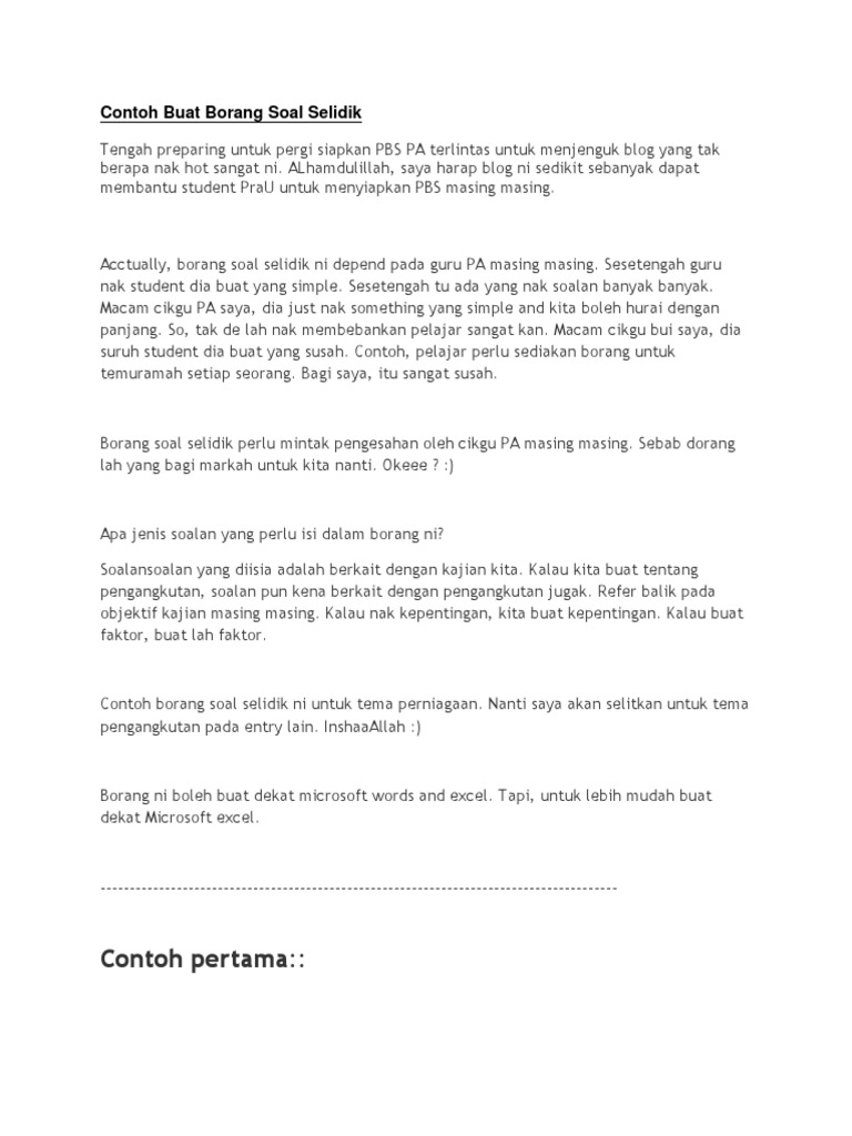 Contoh soal tes masuk sd islam ala model kini. Trainees2013 contoh borang soal selidik pekerjaan penduduk dalam pelbagai kegiatan ekonomi. Kumpulan contoh soal uts sdmi kelas 1 6 semester. Sbanyak 20 responden menjawab borang soal selidik. Subskala utama iaitu subskala ibu bapa kritikal, subskala ibu bapa pengasih, subskala.