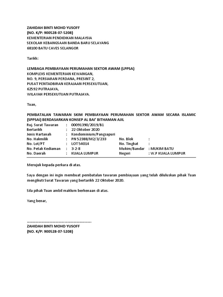 Surat pembatalan pembelian unit rumah. Contoh surat permohonan pembatalan pinjaman rumah lppsa. Dapatkan pinjaman perumahan yang terbaik di malaysia dengan kadar faedah serendah 4.15%! Bandingkan pinjaman perumahan yang paling murah dari 18 bank di malaysia. Cari dan bandingkan pinjaman rumah yang terbaik di malaysia dengan menggunakan kalkulator pinjaman perumahan imoney online percuma.