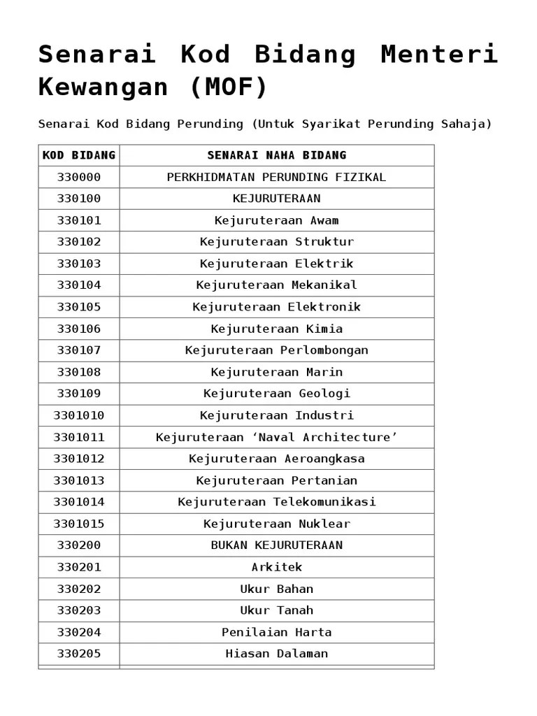 Related : Kod Bidang Mof 2019 - 330101 kejuruteraan awam & 330102 kejuruteraan struktur..