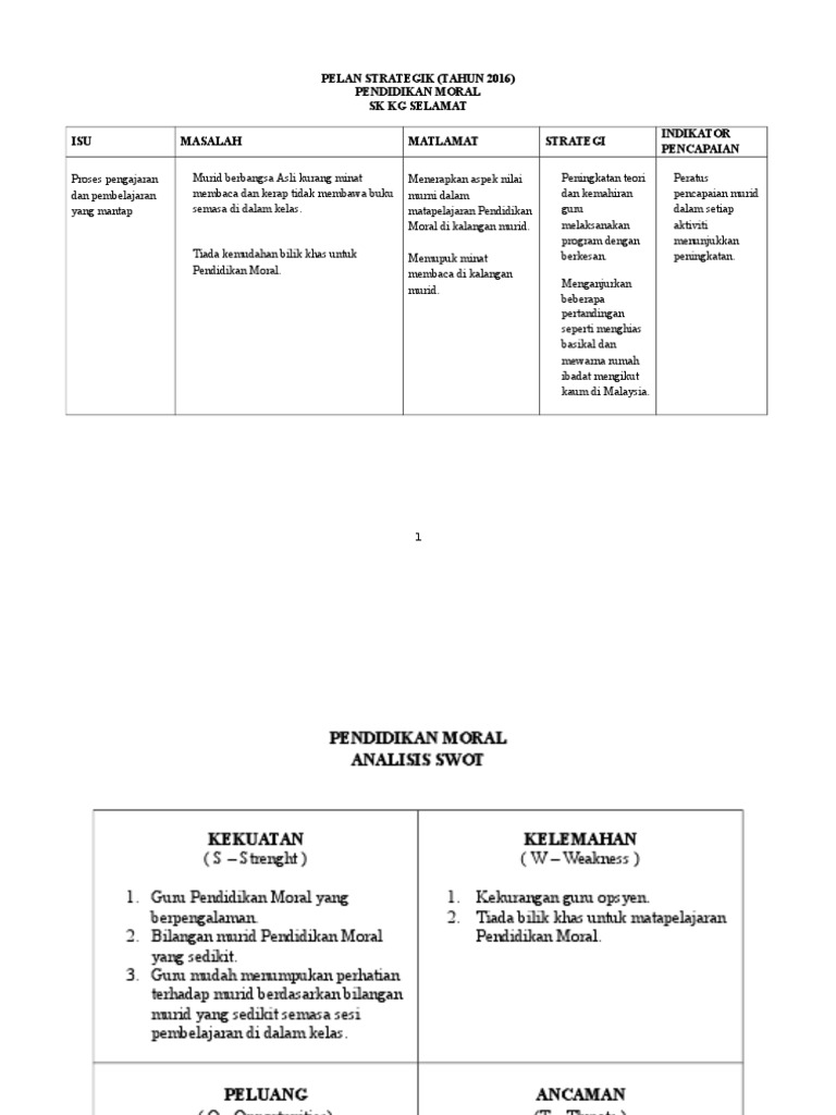 Memupuk minat membaca di kalangan murid. Meningkatkan kelulusan dan prestasi pencapaian pendidikan islam objektif: To view this page ensure that adobe flash player version 10.0.0 or greater is installed. Menghantar surat jemputan kepada penceramah. Sistem otonomi pendidikan yang menjadikan perbedaan sistem penyelenggaraan pendidikan seperti misalnya di skotlandia, welsh, irlandia dan inggris utara dianggap berperan dalam kemunduran sistem pendidikan di seluruh wilayah kerajaan. Pendidikan agama dalam pendidikan masa kini pun memiliki peranan yang sangat penting dalam pembinaan karakter siswa. Savesave pelan strategik pendidikan moral for later. Pendidikan moral memainkan peran yang sangat penting dalam dunia pendidikan selain pendidikan ilmiah dan teknologi. Bakhtiar md shaari, abdul razak hamdan & aziz deraman. Pendidikan moral itu sejatinya adalah proses pembelajaran yang dengannya peserta didik mampu memahami diri mereka sendiri, dan dunia sebagai salah satu agen perubahan, sekolah tentu saja memiliki peran yang sangat esensial bagi pembangunan nilai moralitas. Strategi peningkatan teori dan kemahiran guru melaksanakan program dengan berkesan. 2.2 murid tahun 4 dan tahun 5 mencapai minimum tahap penguasaan 6 dalam mata pelajaran pendidikan moral. Pelan strategik panitia pendidikan moral.