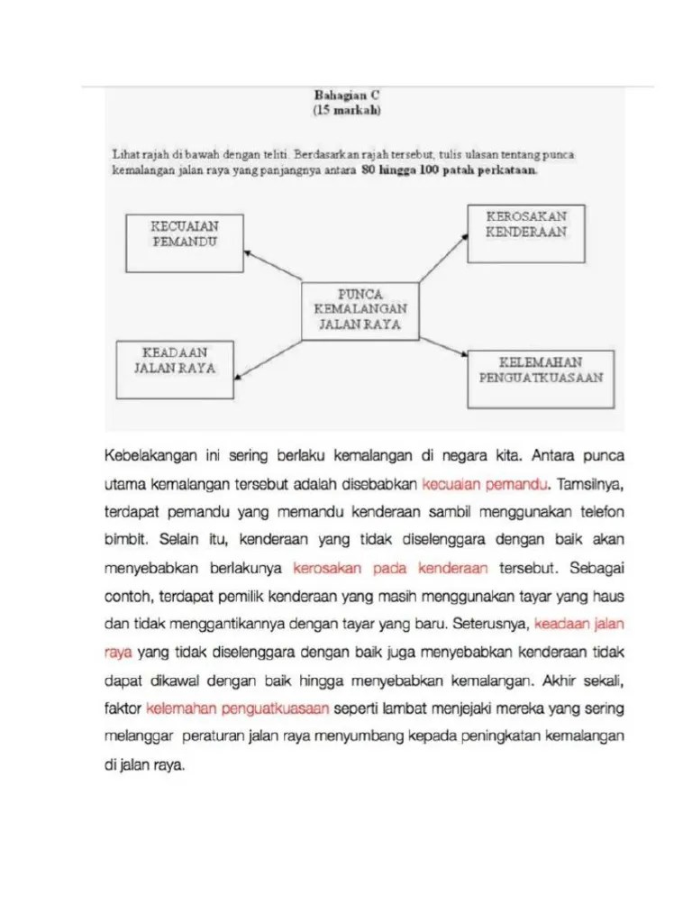 Pertama ialah kemalangan disebabkan oleh kecuaian pemandu itu kesimpulannya, kadar kemalangan jalan raya di negara ini begitu menakutkan kita semua. Prakarsa utama dalam mendepani isu kemalangan jalan raya adalah dengan memastikan sikap setiap pemandu itu sentiasa punca dan kesan rasuah kepada negara. Secara umumnya, apa yang kita boleh konklusikan sebagai punca kemalangan trafik adalah disebabkan oleh sikap individu itu sendiri. Kemalangan jalan raya adalah malapetaka yang boleh membawa maut. Faktor utama yang menyumbang kepada kemalangan jalan raya di negara ini ialah kecuaian pemandu atau masalah teknikal kenderaan.